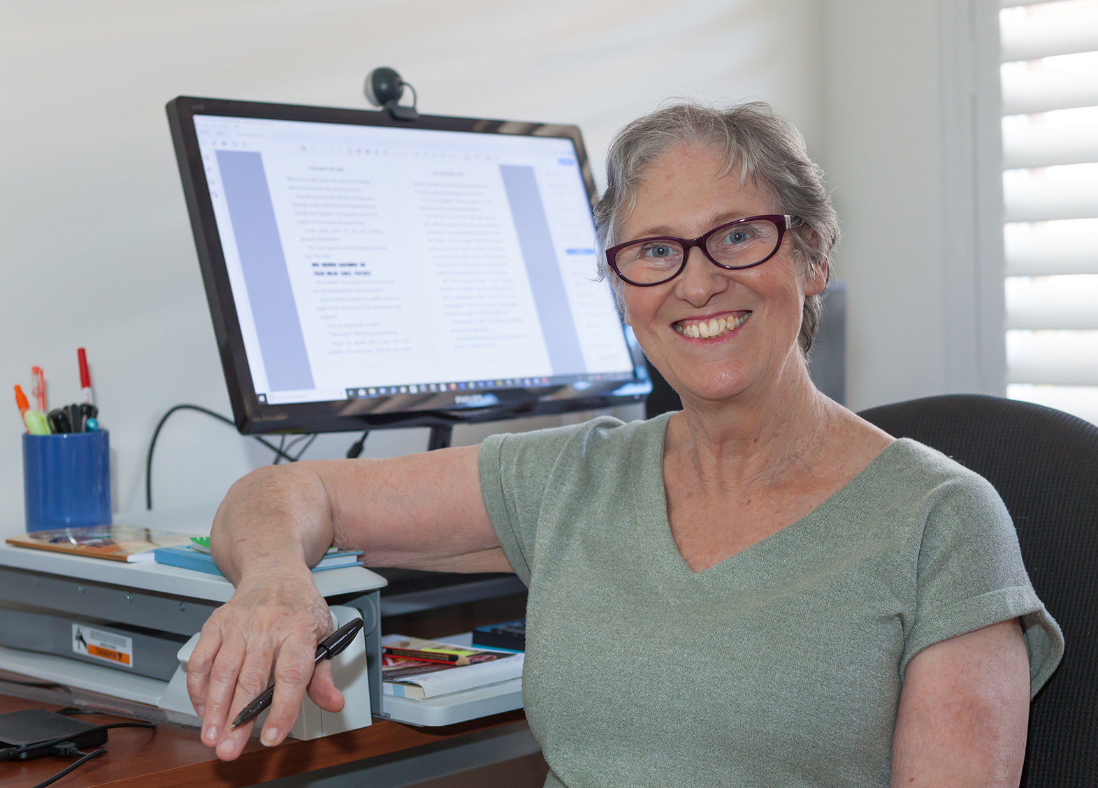 Photo of Teena Raffa-Mulligan in a grey shirt sitting at her computer desk.